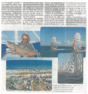 Über Höhepunkt der Saison für Wassersportler informiert das regionale Lokalblatt. „…kaum irgendwo anders gibt es so viele Sonnenstunden und so anspruchsvolle Reviere mit optimalen Windbedingungen zum Segeln, Wind- und Kitesurfen“ wie auf Fehmarn.“